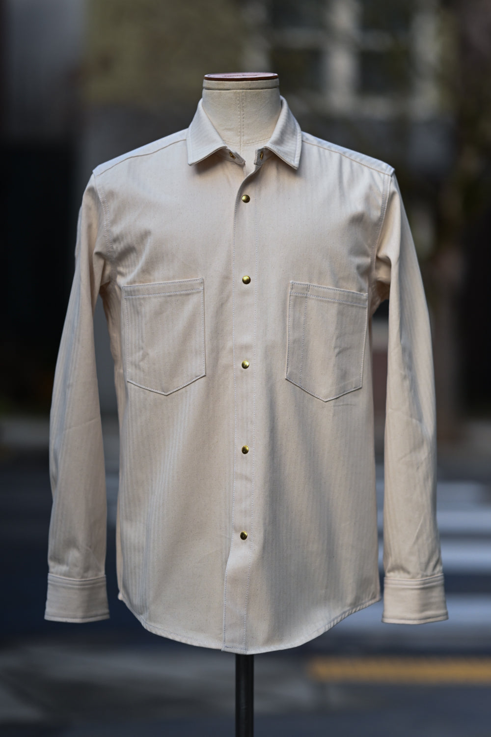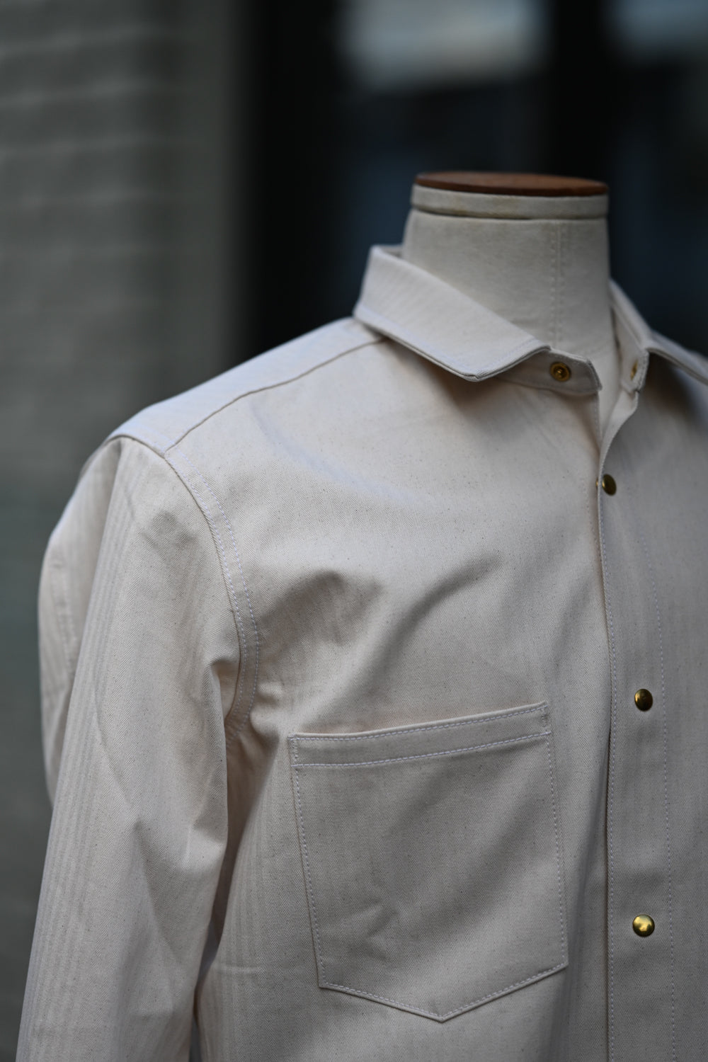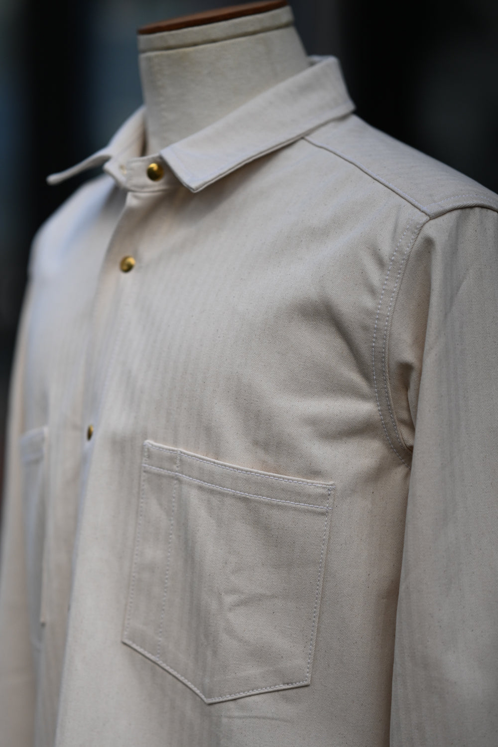 The Long Sleeve Jerry Shirt is back! This time around it's made from a classic 100% cotton herringbone twill in natural. This particular one was inspired by the mechanics/shop shirts of the yesteryear with our own take on it including our brass pearl snaps. Looks good dirty or clean!