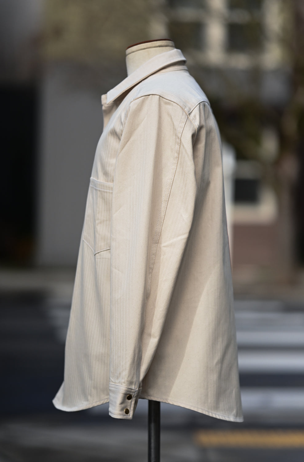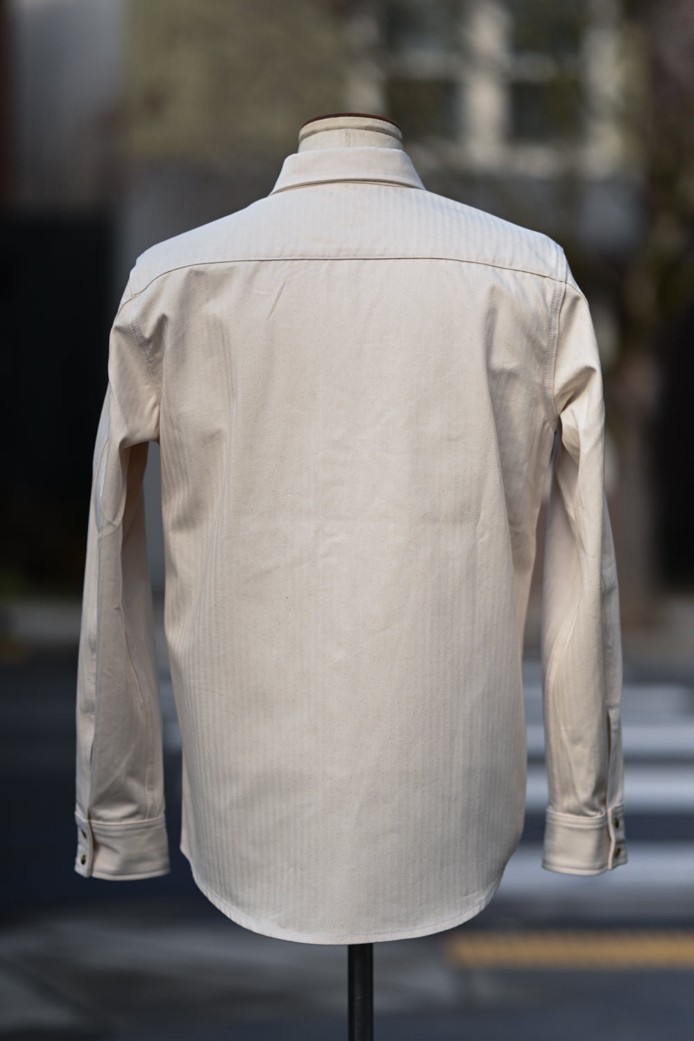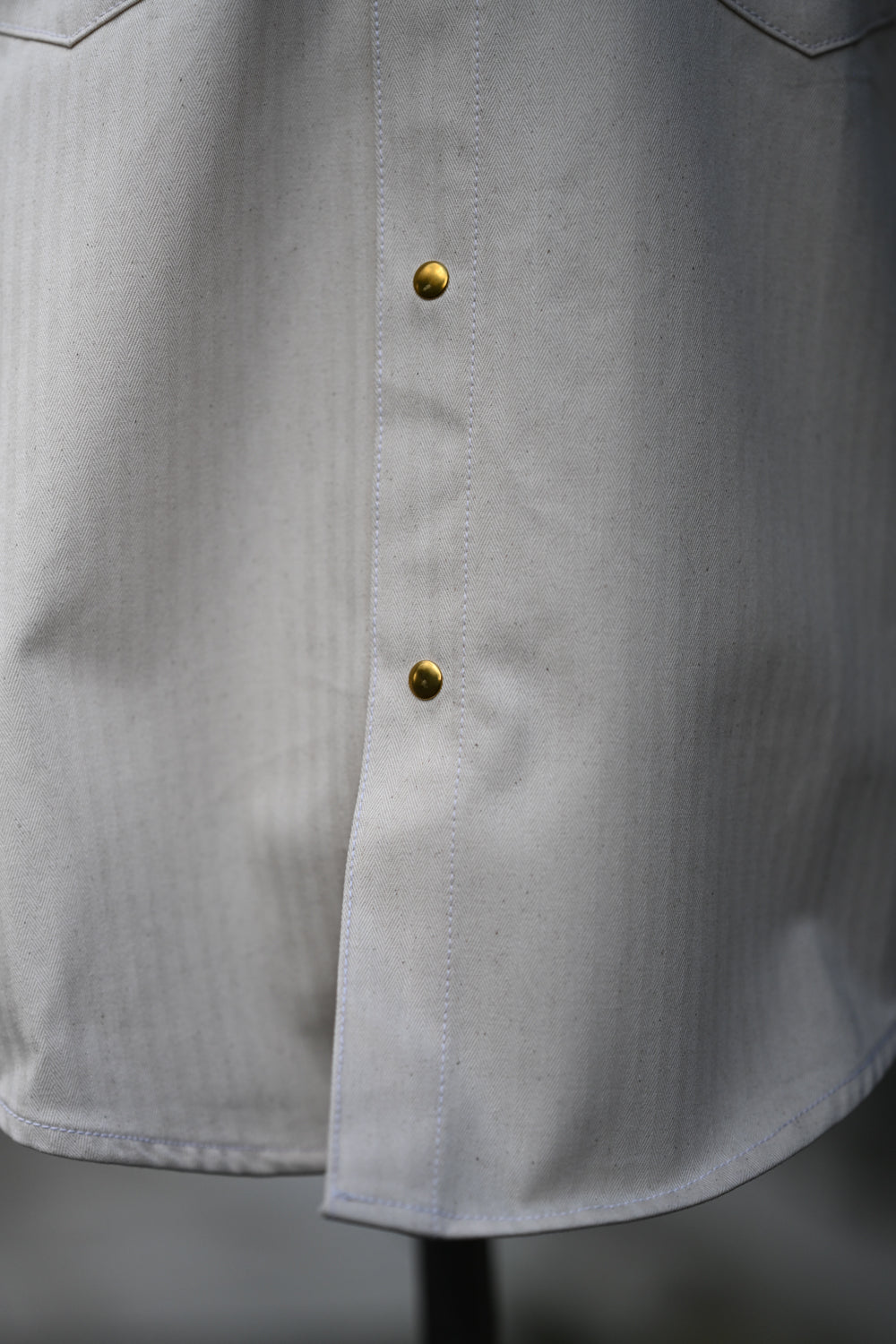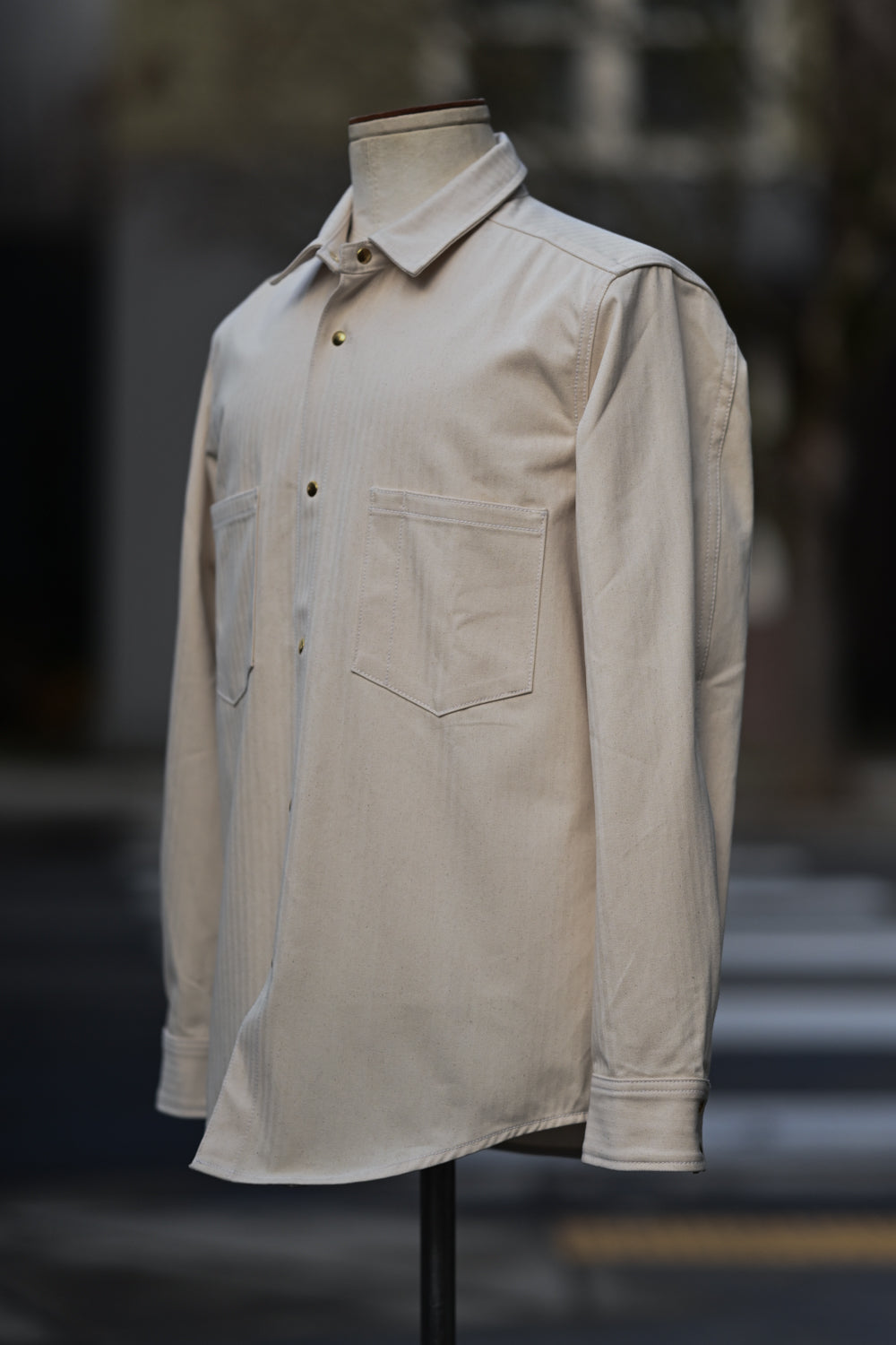 The Long Sleeve Jerry Shirt is back! This time around it's made from a classic 100% cotton herringbone twill in natural. This particular one was inspired by the mechanics/shop shirts of the yesteryear with our own take on it including our brass pearl snaps. Looks good dirty or clean!